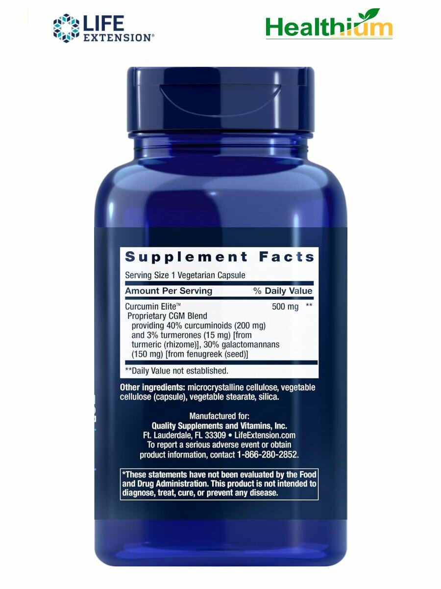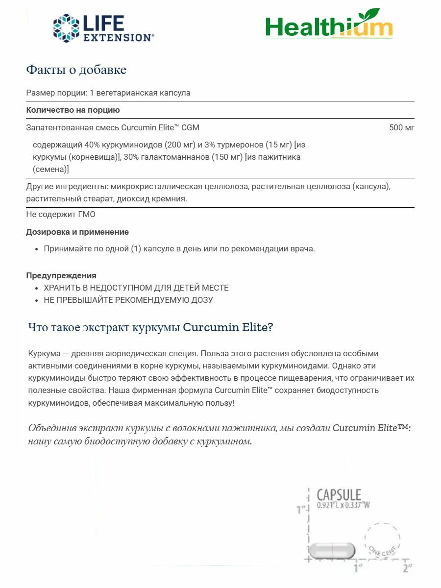| Показания к применению | Life Extension Curcumin Elite — это высокоэффективная добавка с улучшенной биодоступностью, обеспечивающая антиоксидантную защиту и поддержку суставов, сердечно-сосудистой системы и общего здоровья. |