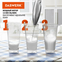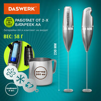 Набор бариста DASWERK 4 в 1 включает в себя всё самое необходимое для приготовления лучшего кофе в мире. Капучинатор оснащен мощным мотором и создает плотную и бархатистую пену за считаные секунды. Он прост в использовании, интуитивно понятен и обеспечивает высококачественный результат. Удобная подставка из нержавеющей стали идеально впишется в интерьер вашей кухни, а покрытие корпуса soft touch сделает использование прибора еще приятнее. Питчер для молока из нержавеющей стали снабжен внутренней разметкой, которая не портит внешний вид молочника, а специальная форма носика идеальна для латте-арта. Трафареты из нержавеющей стали помогут легко сделать рисунок из какао или корицы на поверхности пенки. Набор имеет элегантный дизайн и отличается высоким качеством сборки, что делает его прекрасным подарком для кофеманов. Важно! Батарейки 2хАА в комплект не входят.