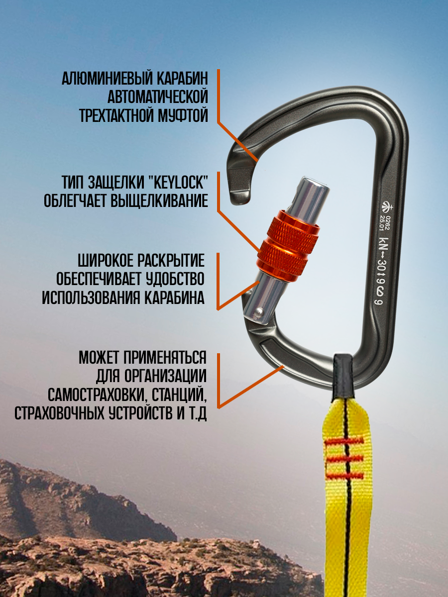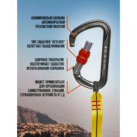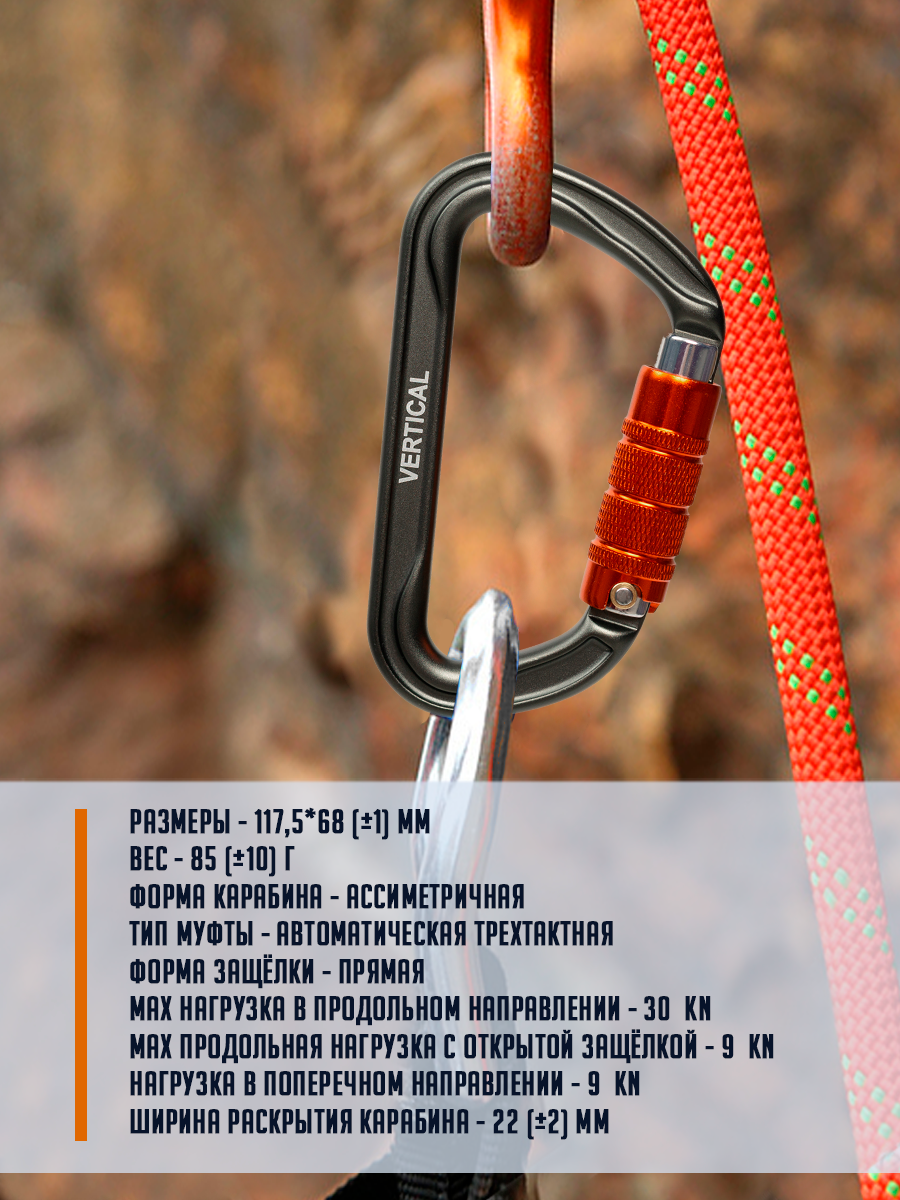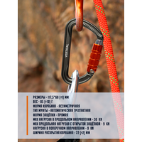 Алюминиевый карабин с автоматической трехтактной муфтой. Может применяться для организации самостраховки, станций, страховочных устройств и т. д. Широкое раскрытие обеспечивает удобство использования карабина. Используется на соревнованиях, в альпинизме, туризме и спелеологии. Тип защелки "keylock" облегчает выщелкивание. Автоматическая трехтактная муфта позволяет максимально снизить риск самопроизвольного раскрытия карабина, сохранив скорость работы с карабином-автоматом. Размеры - 117,5х68 мм. Вес - 85 гр. Форма карабина - ассиметричная Тип муфты - автоматическая трехтактная Форма защёлки - прямая Мах нагрузка в продольном направлении - 30 kN Max продольная нагрузка с открытой защёлкой - 9 kN Нагрузка в поперечном направлении - 9 kN Ширина раскрытия карабина - 22 мм.