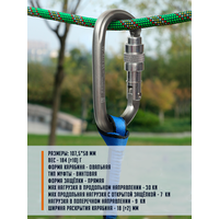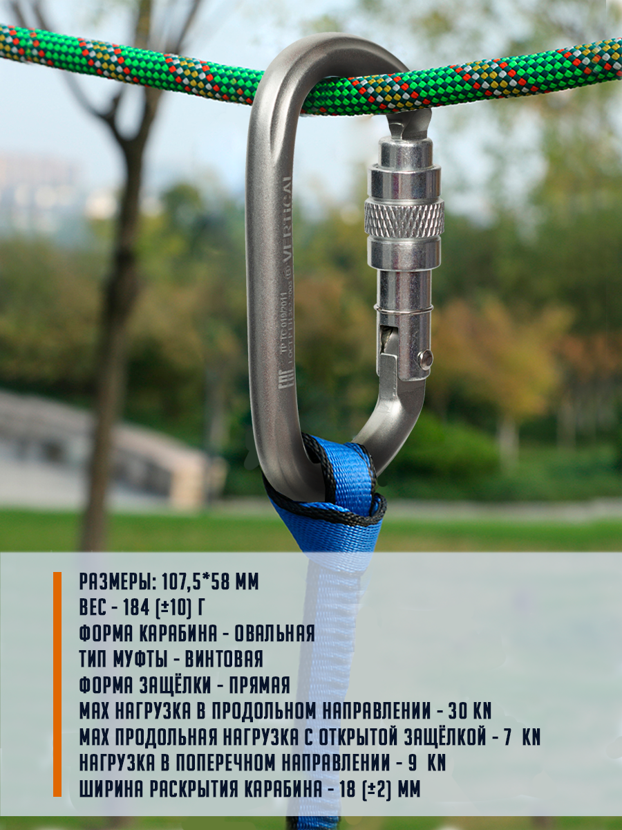 Размеры: 107,5х58,2 мм. Вес - 184 гр. Форма карабина - овальная Тип муфты - с резьбовой муфтой Форма защёлки - прямая Мах нагрузка в продольном направлении - 30 kN Max продольная нагрузка с открытой защёлкой - 8 kN Нагрузка в поперечном направлении - 9 kN Ширина раскрытия карабина - 18 мм. Сертификат - ЕАС.