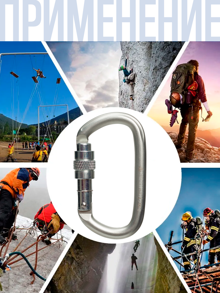Убедитесь в совместимости карабинов с другими элементами страховочной цепи. Совместимость означает правильное взаимодействие и расположение: например, взаимодействие с подключаемыми устройствами, правильное приложение нагрузки на карабин и т.д. Несовместимость может привести к непроизвольному выстегиванию или разрушению карабина или других элементов страховочной цепи.