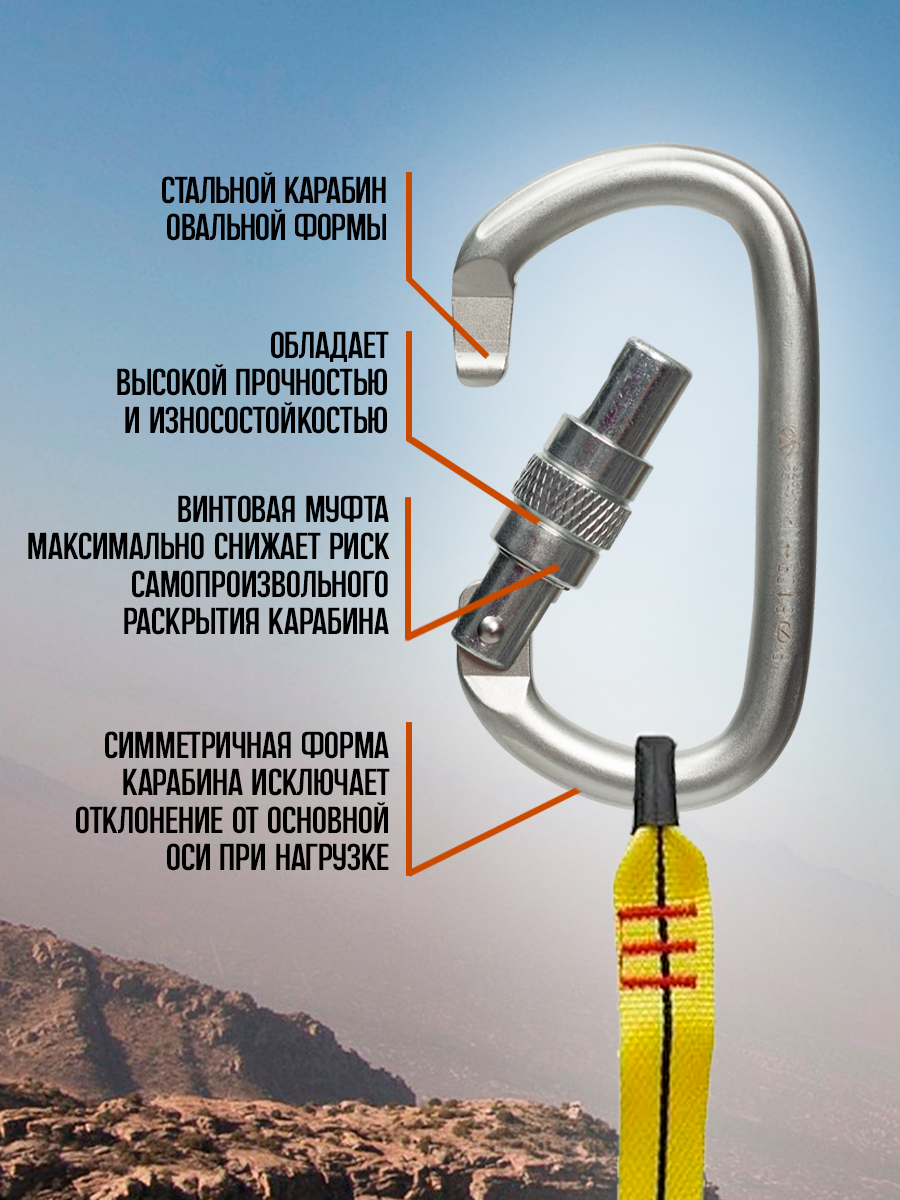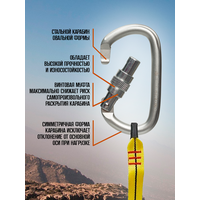 Стальной карабин овальной формы. Может применяться для организации самостраховки, станций, присоединения страховочных устройств в работах на высоте, скалолазании, альпинизме, спелеологии. Симметричная форма карабина исключает отклонение от основной оси при нагрузке, что особенно важно при работе с блок-роликами и устройствами с двумя симметричными щечками. Винтовая муфта максимально снижает риск самопроизвольного раскрытия карабина. Стальной карабин обладает высокой прочностью и износостойкостью.