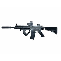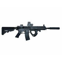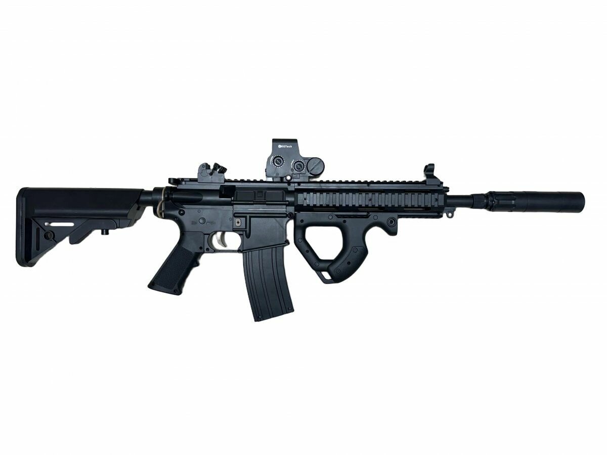 Имеется 4 планки пикатинни, на которые можно установить любое доп. оборудование (можно приобрести барабанный магазин, лазерный целеуказатель, фонарик). Регулируемый по длине телескопический приклад.