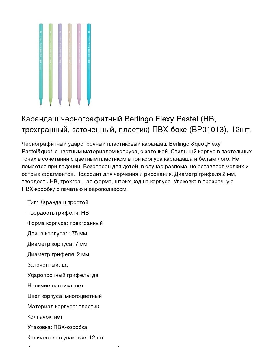 Карандаш чернографитный Berlingo Flexy Pastel (НВ, трехгранный, заточенный, пластик) ПВХ-бокс (BP01013), 12шт.: сравнение цен, характеристики, фото, актуальное наличие и цены.