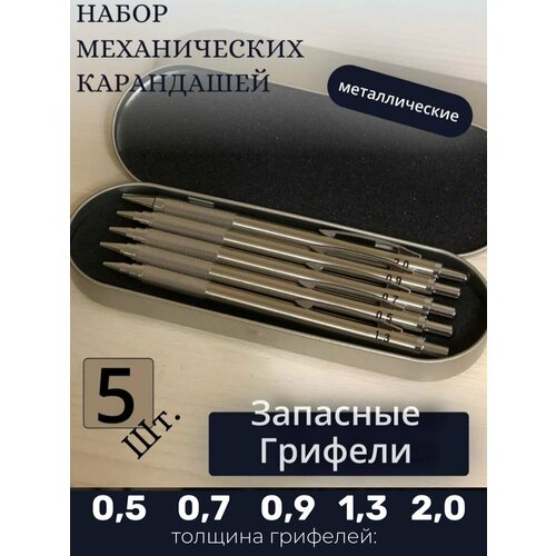 Набор карандашей включает в себя 5 металлических карандашей, запасные грифели к ним и металлический пенал(кейс).