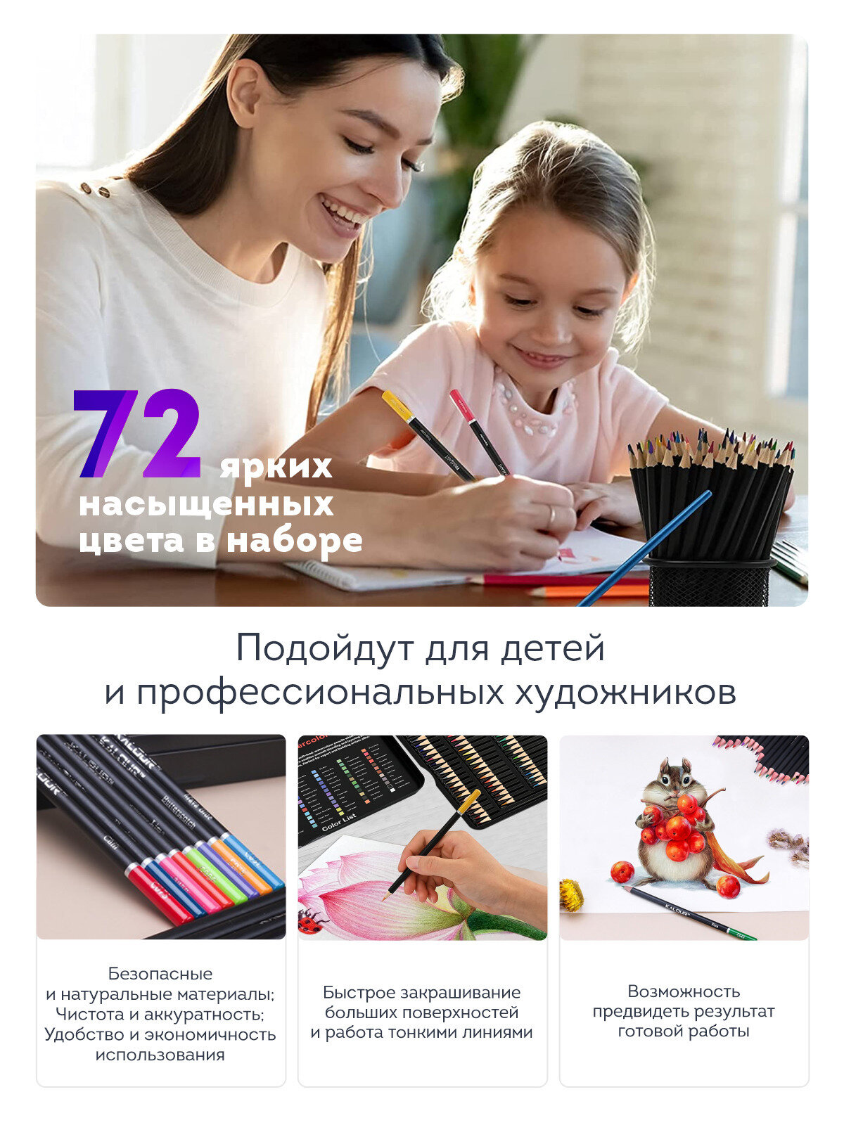 Мягкие цветные карандаши подойдут для начинающих и продвинутых художников: 72 цвета – создают безграничные возможности для творчества. Карандаши подойдут не только профессиональным художникам, но и взрослым и детям (и даже малышам), кто только учиться рисовать. Профессиональные цветные карандаши с прочными мягкими грифелями, изготовленными из высококачественных пигментов, легко ложатся на любую бумагу. Красивые, яркие цвета в наборе для вашего творчества подойдут для разных техник рисования. Вы сможете создать портрет, натюрморт, пейзаж или даже аниме и комикс. Могут использоваться в смешанных техниках. Карандаши просты в использовании, позволяют поэтапно создавать рисунки любой сложности, с ними возможно нарисовать и простой рисунок, и создать сложные творческие работы как профессиональный художник - легко и изящно.