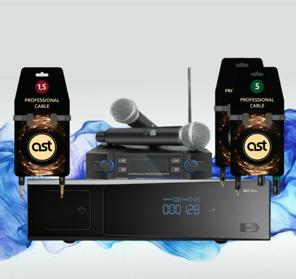 | Подробная комплектация | Караоке аппарат AST mini, кабель питания, кабель HDMI 2-метра, расширенный пульт дистанционного управления, композитный аудио/видео кабель (тюльпаны) 3-метра, USB-накопитель,4 батарейки типа АА. Микрофоны AV-205: База/Приемник сигнала - 1 шт, беспроводной микрофон - 2шт, адаптер питания - 1шт, кабель Jack 6.3 - 1шт, 4 батарейки типа АА. Кабель коммутации AST Jack-Jack 3 метра - 1 шт. Кабель коммутации AST RCA-XLR 5 метра - 2 шт. |