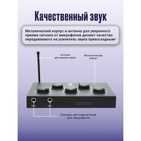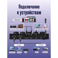 | Подробная комплектация | 1. Основной блок 2. 2 беспроводных микрофона 3. Кабель питания 4. Аудио кабель 3,5 mini jack—3.5 mini jack 5. Аудио кабель 3,5 mini jack—2 RCA 6. Оптический кабель 7. Руководство пользователя на русском языке |