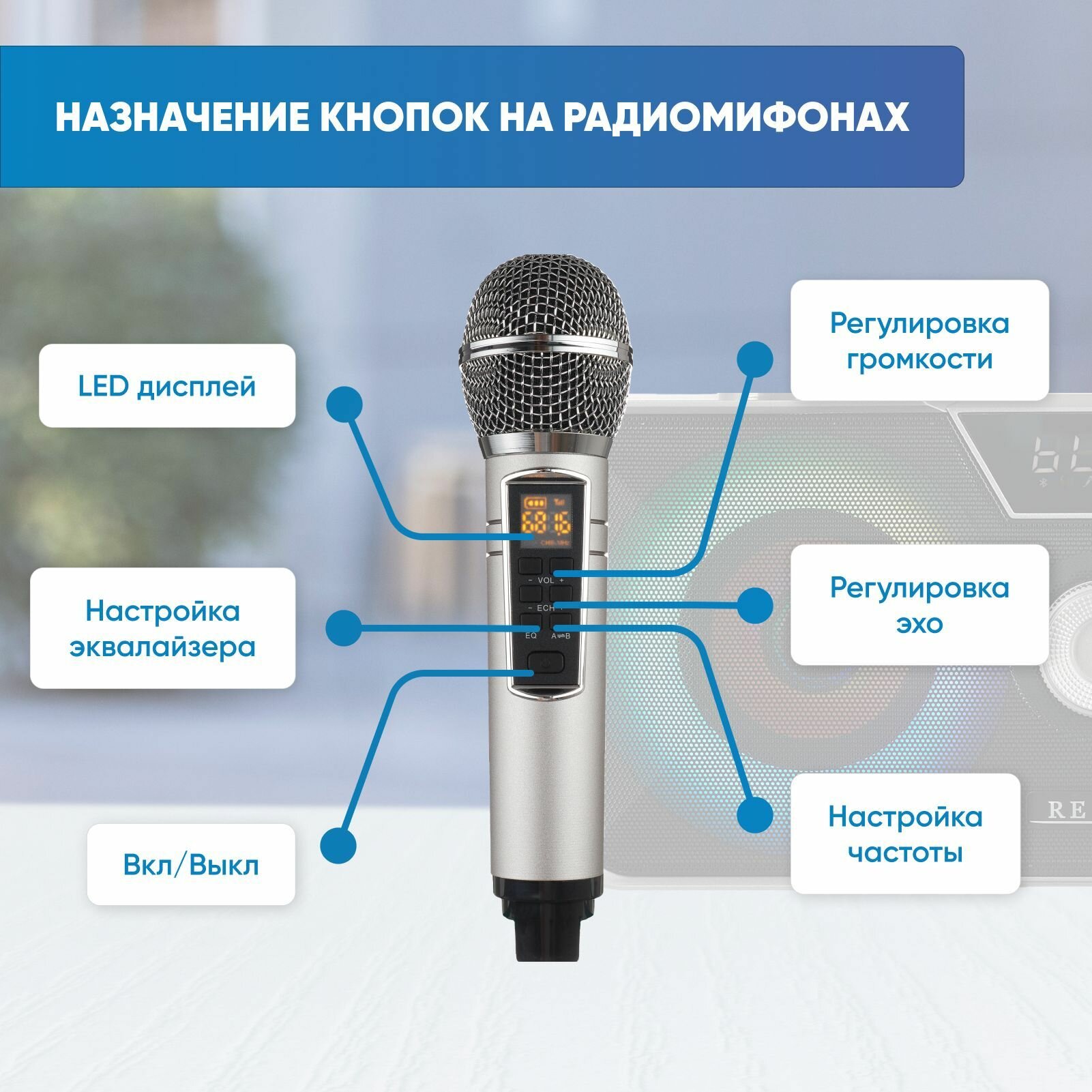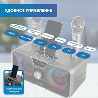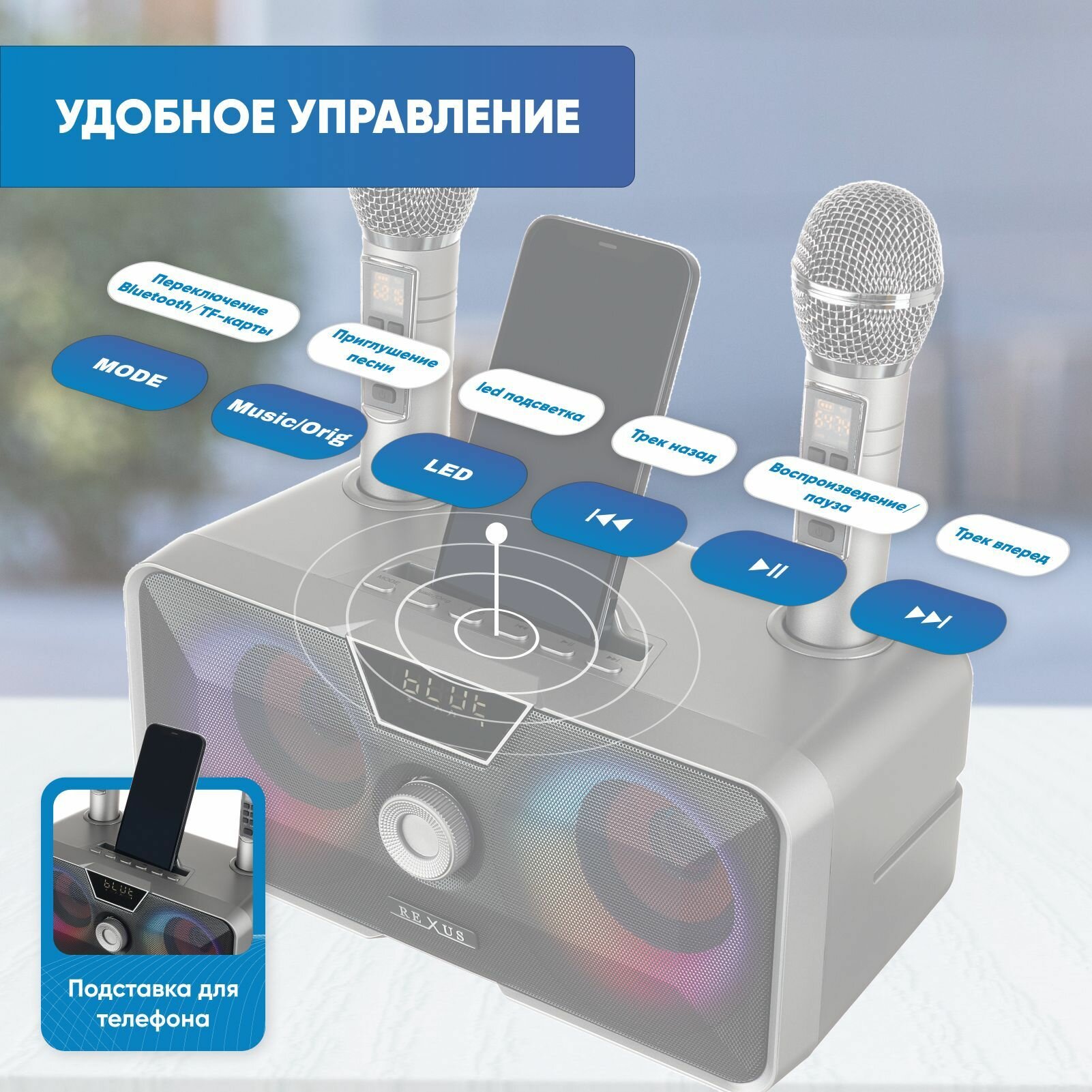 Купить Караоке система REXUS SD-317 Grey, с двумя радиомикрофонами, LED подсветка, Bluetooth, AUX с доставкой по всей России.