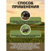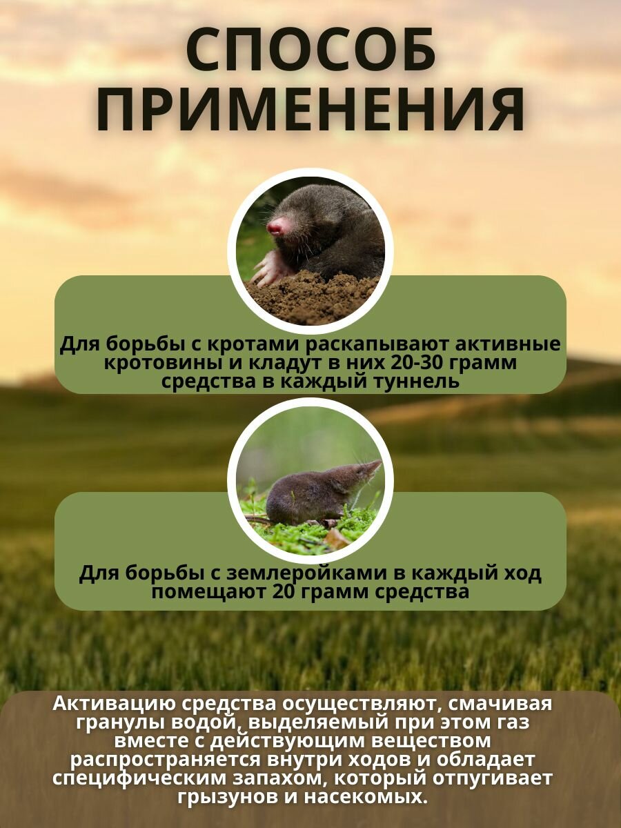 Для борьбы с кротами раскапывают активные кротовины и кладут в них 20 — 30 г средства в каждый туннель. Для борьбы с землеройками в каждый ход помещают 20 г средства. Активацию средства осуществляют, смачивая гранулы водой, выделяемый при этом газ вместе с действующим веществом распространяется внутри ходов и обладает специфическим запахом, который отпугивает грызунов и насекомоядных. Чтобы ускорить реакцию и повысить эффективность действия средства отверстия нор закрывают пучком травы, листьями деревьев, бумагой и т.д. или присыпают грунтом, стараясь не повредить туннель. Процедуру повторяют до тех пор, пока активность вредителей не прекратится.