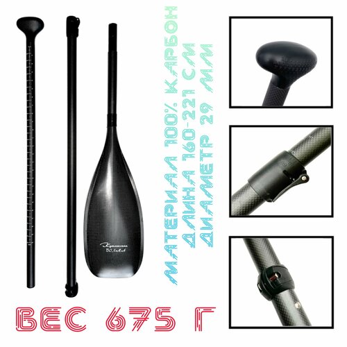 Материал весла - углеродное волокно (карбон). Длина весла 160-221 см. Вес 675 г. Максимальный диаметр древка 29 мм. Размер лопасти: длина - 45 см, ширина - 18 см.