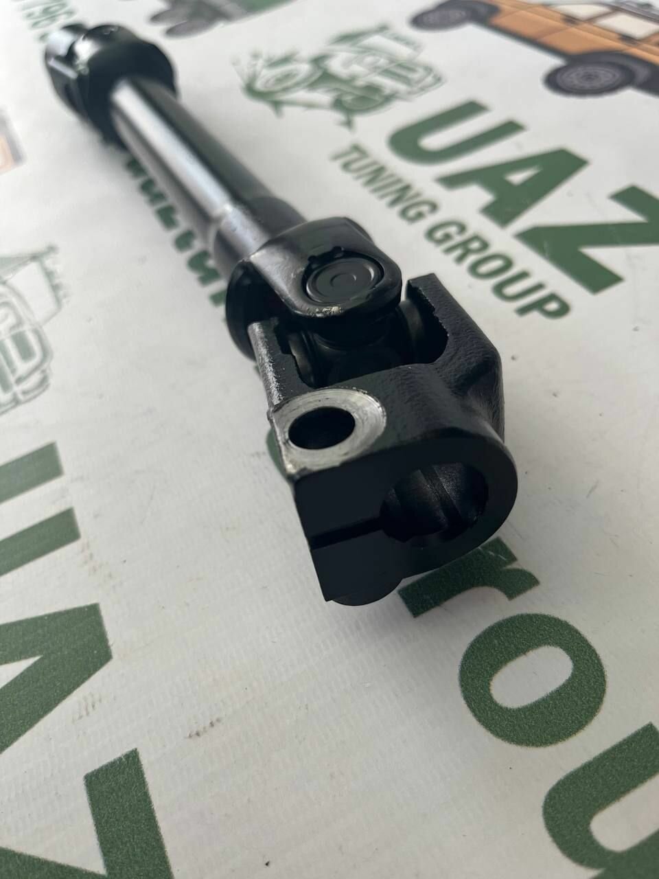 Карданный вал рулевого управления (телескопическая тяга карданного типа) с двумя шарнирами на игольчатых подшипниках - механизм, часть рулевого управления между рулевой колонкой и механизмом ГУР (редуктором). Вилки карданного вала крепятся к валу колонки и валу ведущей шестерни углового редуктора клиньями, которые затянуты гайками со шплинтами.