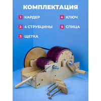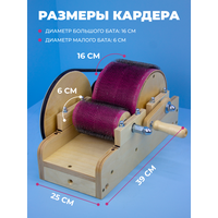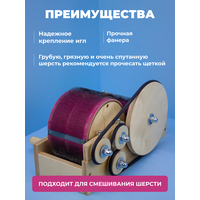 Преимущества кардера для шерсти: Прочность - кардер выполнен из прочной 2 см многослойной фанеры. Практичность - плотное полотно кардоленты (1.4 cм) и прочные крепения иголок позволяет чесать, как грубую и спутанную шерсть, так и смешивать шерсть разных цветов Ширина бата - 12 см внимание: