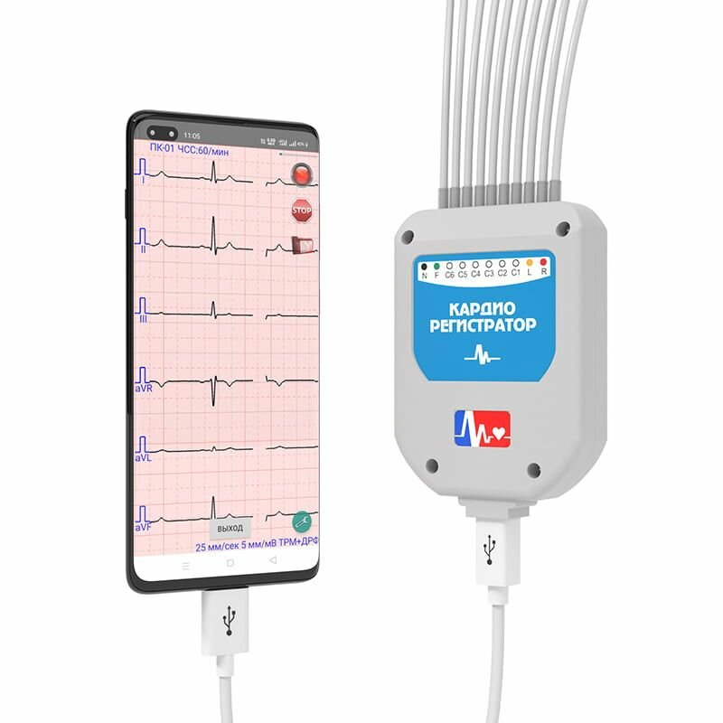 Основной диагностический модуль представляет собой отдельное устройство, оборудованное десятиэлектродным встроенным кабелем для снятия кардиологических показателей. USB-разъем обеспечивает питание кардиорегистратора от компьютера или смартфона. Полученные данные легко выводятся на любое мобильное или стационарное цифровое устройство для дальнейшего анализа и обработки.