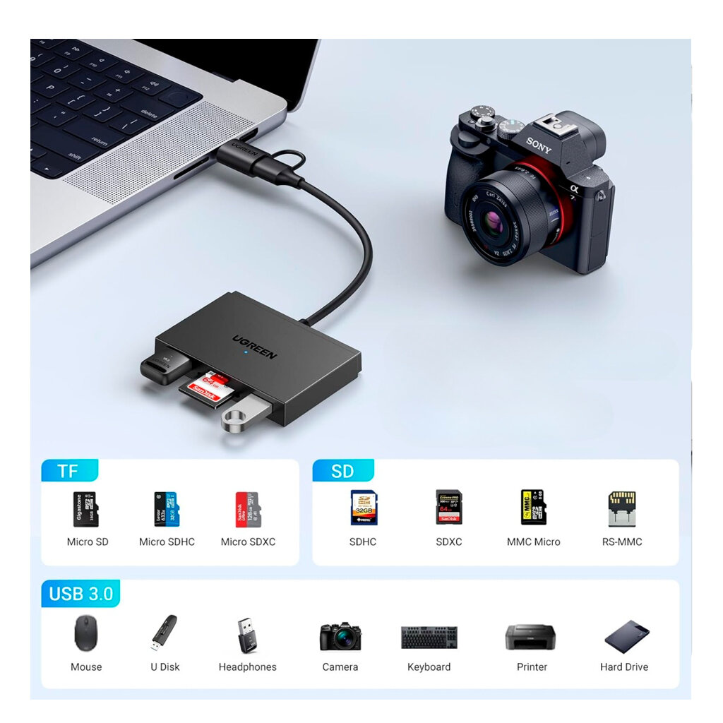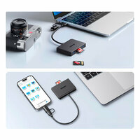 Поддержка скорости чтения 170 МБ/с и скорости передачи 5 Гбит/с. Интерфейс USB-C/USB-А 3.0 (адаптер). Совместимо с картами SD/MicroSD, SDHC/MicroSDHC и SDXC/MicroSDXC, а также со всеми типами камер, флэш-накопителей, клавиатур, мышей, жестких дисков и т. д. Благодаря 2 портам USB 3.0 можно одновременно подключать клавиатуру и USB-накопитель к USB-C iPad/Macbook/iMac. Драйвер не требуется. Совместимость: Windows 11/10/8.1/8/7/XP/Vista, Mac OS, Linux, Chrome OS. Совместимость с большинством устройств с USB-C, такими как iPhone 15/15 Plus, iPad Pro/Air/Mini, MacBook Pro, Samsung Galaxy S23/S22/Note 20 и т. д. Световой индикатор позволяет узнать состояние подключения устройства.