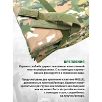 Предусмотрены два крепления к системе MOLLE, дополненные липучкой/велкро. Каремат может крепиться к разгрузке или плитнику как подсумок или же может быть закреплён на поясе с помощью строп, соединённых на лупучку/велкро.