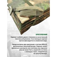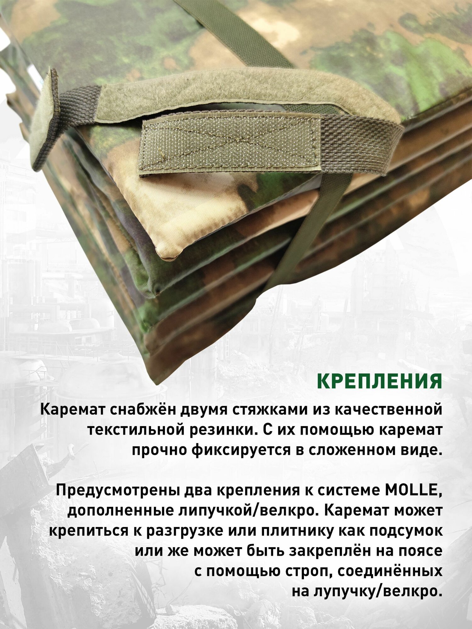 Предусмотрены два крепления к системе MOLLE, дополненные липучкой/велкро. Каремат может крепиться к разгрузке или плитнику как подсумок или же может быть закреплён на поясе с помощью строп, соединённых на лупучку/велкро.