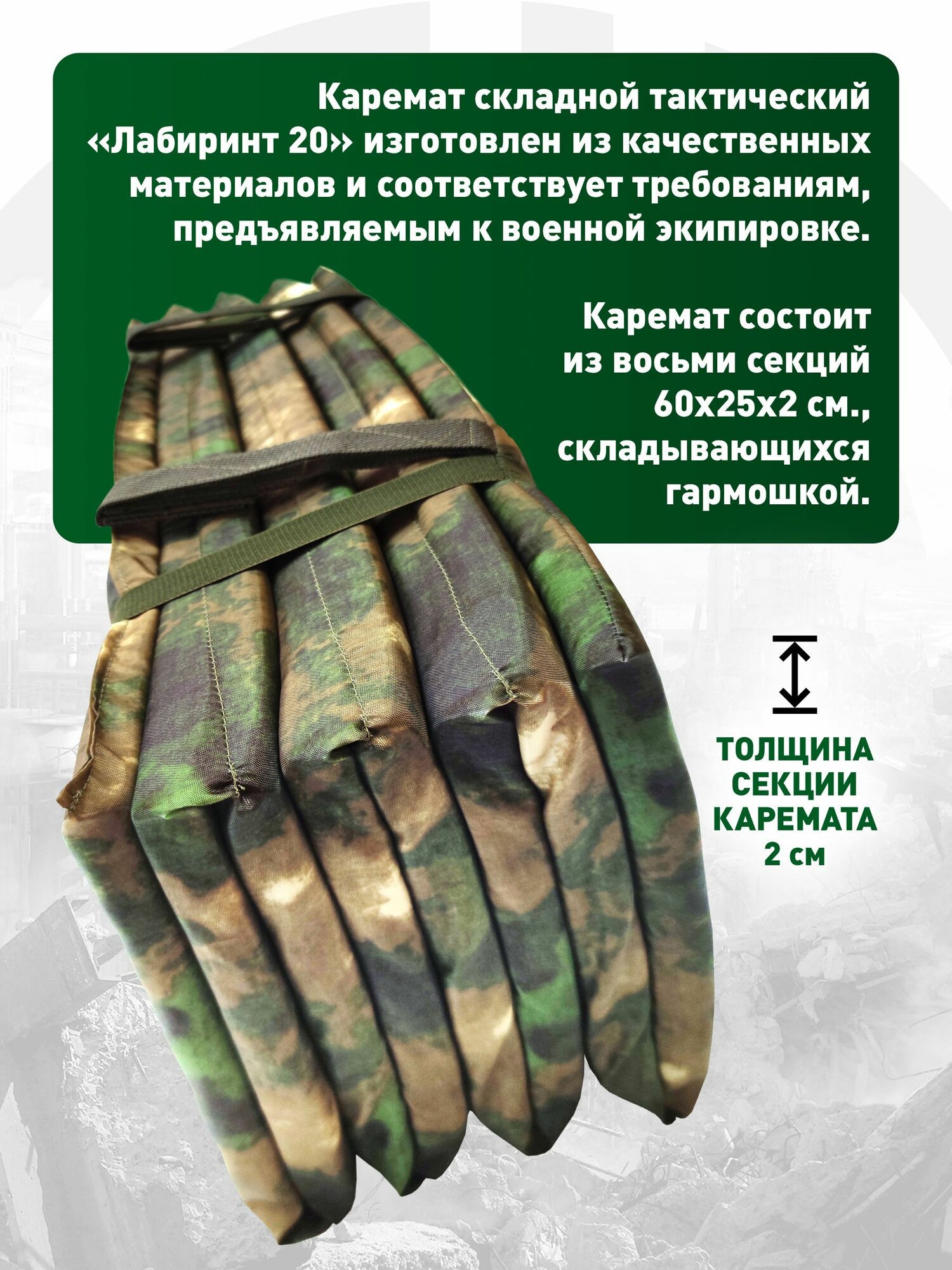 Каремат складной тактический «Лабиринт 20» изготовлен из качественных материалов и соответствует требованиям, предъявляемым к военной экипировке. Каремат состоит из восьми секций 60х25 см, складывающихся гармошкой.