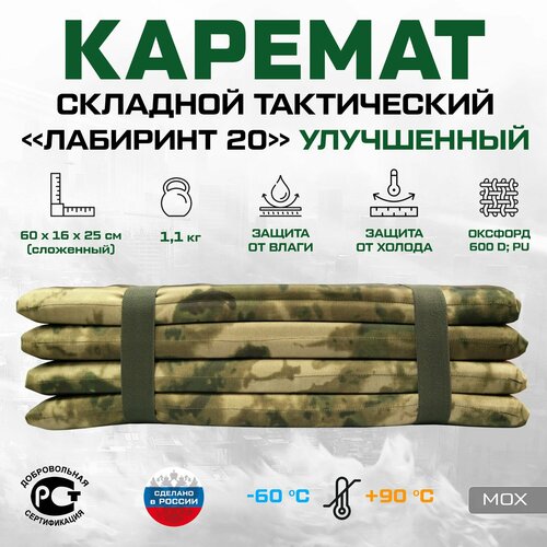 Каремат складной тактический улучшенный мох изготовлен сотрудниками опытно-конструкторского предприятия «Лабиринт» из пенополиэтилена толщиной 20 мм и ткани Оксфорд плотностью 600D с полиуретановым покрытием. Каремат состоит из 8 секций размером 60*25 см, складывающихся гармошкой и соответствует требованиям, предъявляемым к военной экипировке.