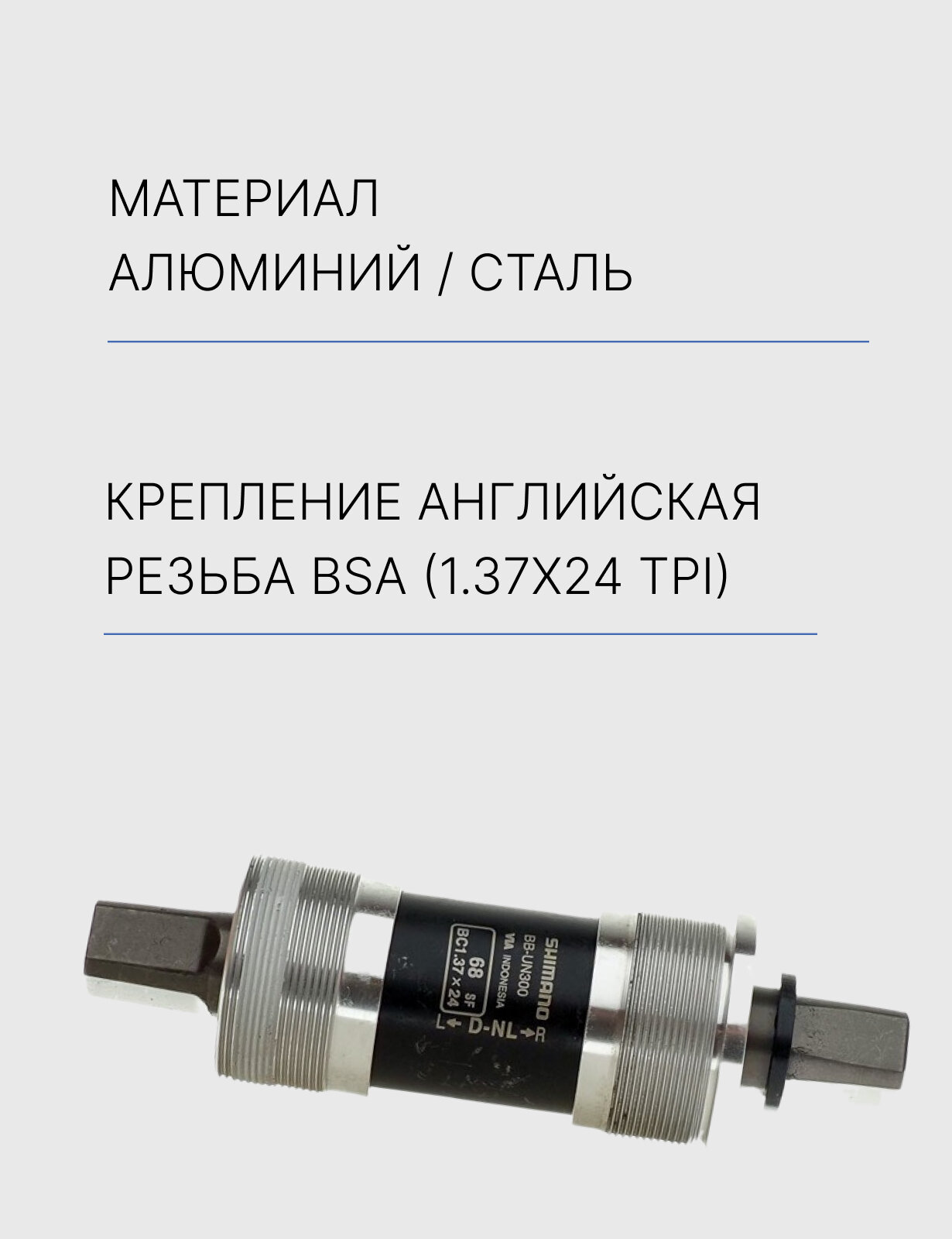 Характеристики: Марка - Shimano; Модель - BB-UN300 (D-EL); Материал - Алюминий / Сталь; Крепление - Английская резьба BSA (1.37x24 tpi); Разработка - Япония; Особенности - Картридж, 68/127.5 мм, крепление шатунов под квадрат; Производство - Индонезия; Цвета (выпускаемые) - серый;