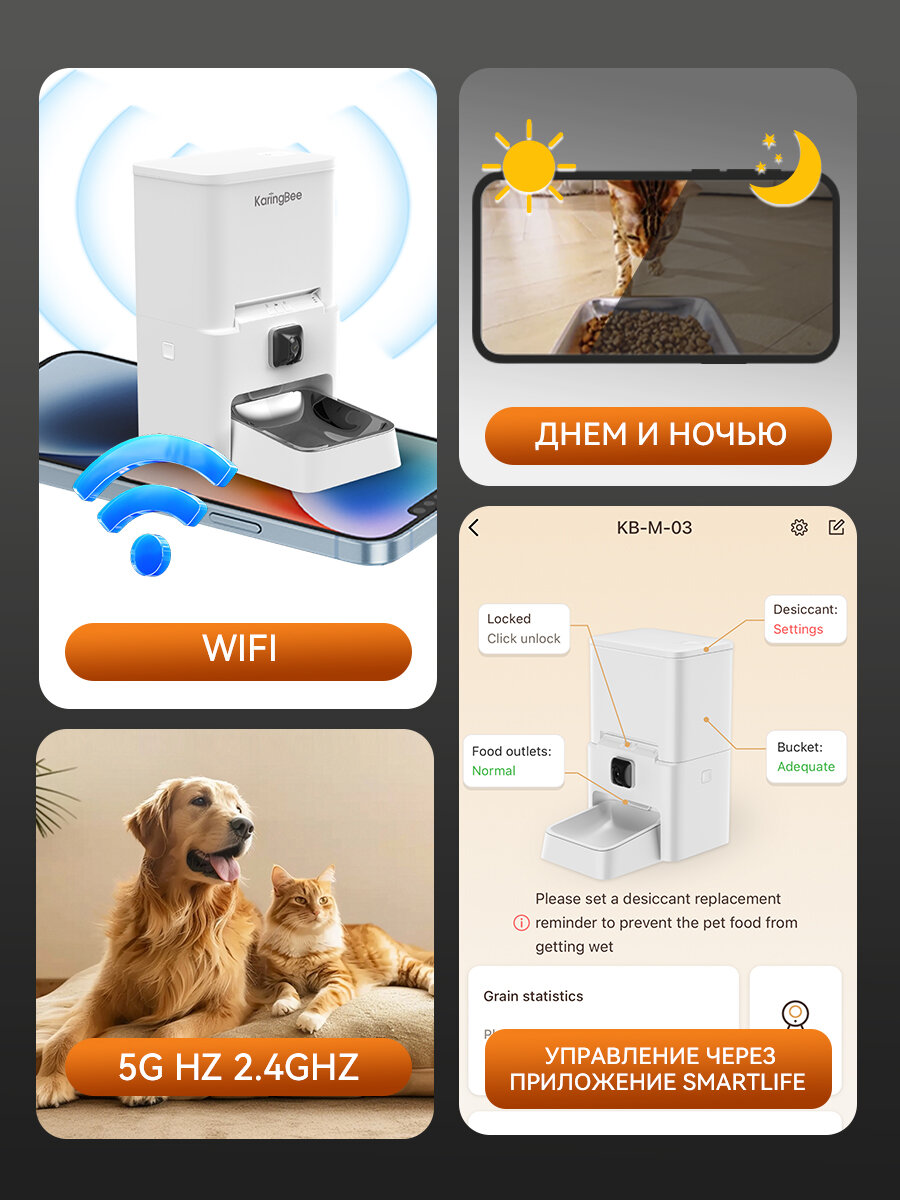 Автокормушка KaringBee оснащена камерой WiFi, которая позволяет вам наблюдать за вашими питомцами в реальном времени. Это особенно удобно, если вы часто不在 дома или хотите удостовериться, что вашему питомцу доставляют еду регулярно.