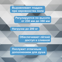 Каркас для полукруглого душевого поддона предназначен для удобства и облегчения установки стальных эмалированных душевых поддонов на пол сантехнического помещения, и обеспечивает легкий доступ при последующей профилактике сливной системы. Простота сборки каркаса и монтажа на него типового душевого поддона значительно уменьшает трудозатраты сантехническим монтажным организациям или отдельным частным лицам. Процесс сборки самого каркаса и установки на него поддона занимает не более одного часа и сохраняет полную чистоту рабочего места. Конструкция каркаса состоит из: оцинкованной трубы квадратного сечения 20 мм, для крепления труб между собой, используется «краб-система»-подобное крепление для профильной трубы обеспечивает получение прочного и надежного соединения, которое практически ничем не хуже сварного. Ножки поддона регулируются по высоте: от 230 до 350 мм. Преимущества: • для демонтажа металлоконструкции из профильной трубы не требуется дополнительный инструмент кроме разводного ключа; • распределение нагрузки по всему каркасу; • обеспечение дополнительной прочности и жесткости конструкции. Также в конструкции используется заглушки с резьбой М8, опора резьбовая М8. Удобная транспортировка – упакованная опора легко перевозится в легковом автомобиле.