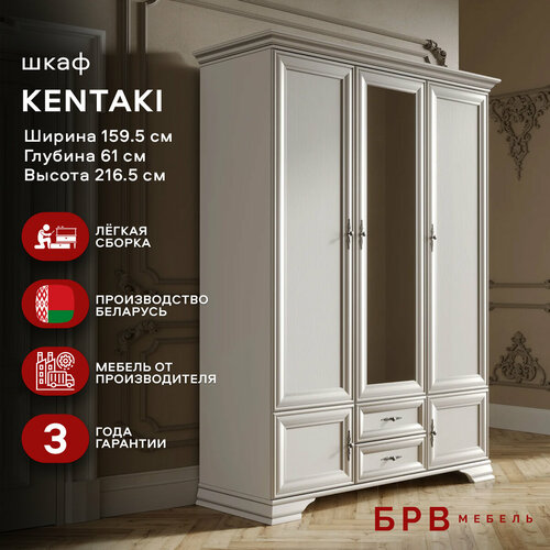 Трехстворчатый зеркальный шкаф белого цвета Kentaki изготовлен из плиты ЛДСП, внешне схожей с натуральным деревом, и вспомогательного материала МДФ. Его основными элементами являются распашные дверцы, ящики, отделения и полки. Благодаря тщательно подобранным размерам (высота 216,5 см, глубина 60,5 см, ширина 159,5 см), производителю из Белоруссии удалось создать вместительный блок для хранения вещей.
