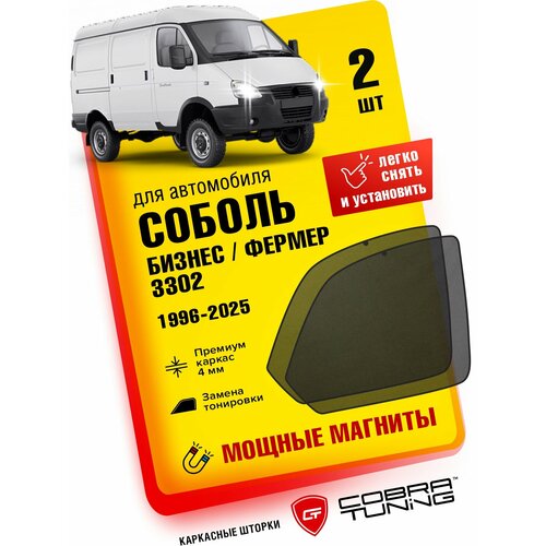 Каркасные солнцезащитные шторки на магнитах повторяют изгибы оконного проема автомобиля Газель Соболь, Бизнес, Фермер 1996-2025, на передние боковые окна. Устанавливается данный аксессуар в оконную раму передних дверей, крепится на магнитах. Магниты идут встроенные в шторку, не нужно приклеивать магниты на дверь, надо всего лишь шторку прислонить к оконной раме, и шторка притянется к двери.