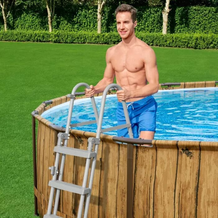 Каркасный бассейн Splashview Pool предлагает большое пространство для развлечений всей семьи. Прочные на разрыв, устойчивые к УФ-излучению боковые стенки из материала TriTech надежно выдерживают нагрузки, вызванные весом и движением. Трехслойная окружная лента придает боковым стенкам дополнительную устойчивость. Коррозионностойкая стальная рама с антипригарным покрытием. Система ClickConnect предотвращает контакт металла с металлом и позволяет быстро собрать стальной каркас и облицовку бассейна силами 2-3 человек за 40 минут. Внешние стены из сосны. Имитация дерева, пол под мозаику из гальки, 2 водонепроницаемых иллюминатора Splashview обеспечивают интерактивное подводное приключение.