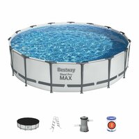 Сборный круглый каркасный бассейн Bestway 56488 457х107см. серии Steel Pro (Bestway) с фильтр-насосом, лестницей и тентом. Чаша бассейна изготовлена из высококачественного трехслойного ПВХ: два слоя плотного винила и один — полиэстер для особой прочности. Для дополнительной защиты и поддержания формы используется лента из полипропилена, «опоясывающая» весь бассейн. Стойки каркаса усиленные стальные с специальным антикоррозийным покрытием. Конструкция бассейна надежная и прочная, выдерживает высокие нагрузки, одновременно пользоваться бассейном могут несколько человек. Установка каркасного бассейна Bestway 56488 максимально простая. Нужна лишь плоская горизонтальная поверхность. Нет необходимости в бетонировании площадки или подготовки ямы для последующего заглубления. Процесс сборки бассейна до наполнения водой занимает 60 минут. Каркасные бассейны Бествей Steel Pro (Bestway) относятся к сезонным бассейнам, в соответствии с рекомендациями производителя их необходимо разбирать на холодное время года. Бассейн оборудован сливным клапаном, который присоединяется к садовому шлангу и позволяет быстро слить воду из бассейна на зимний период.