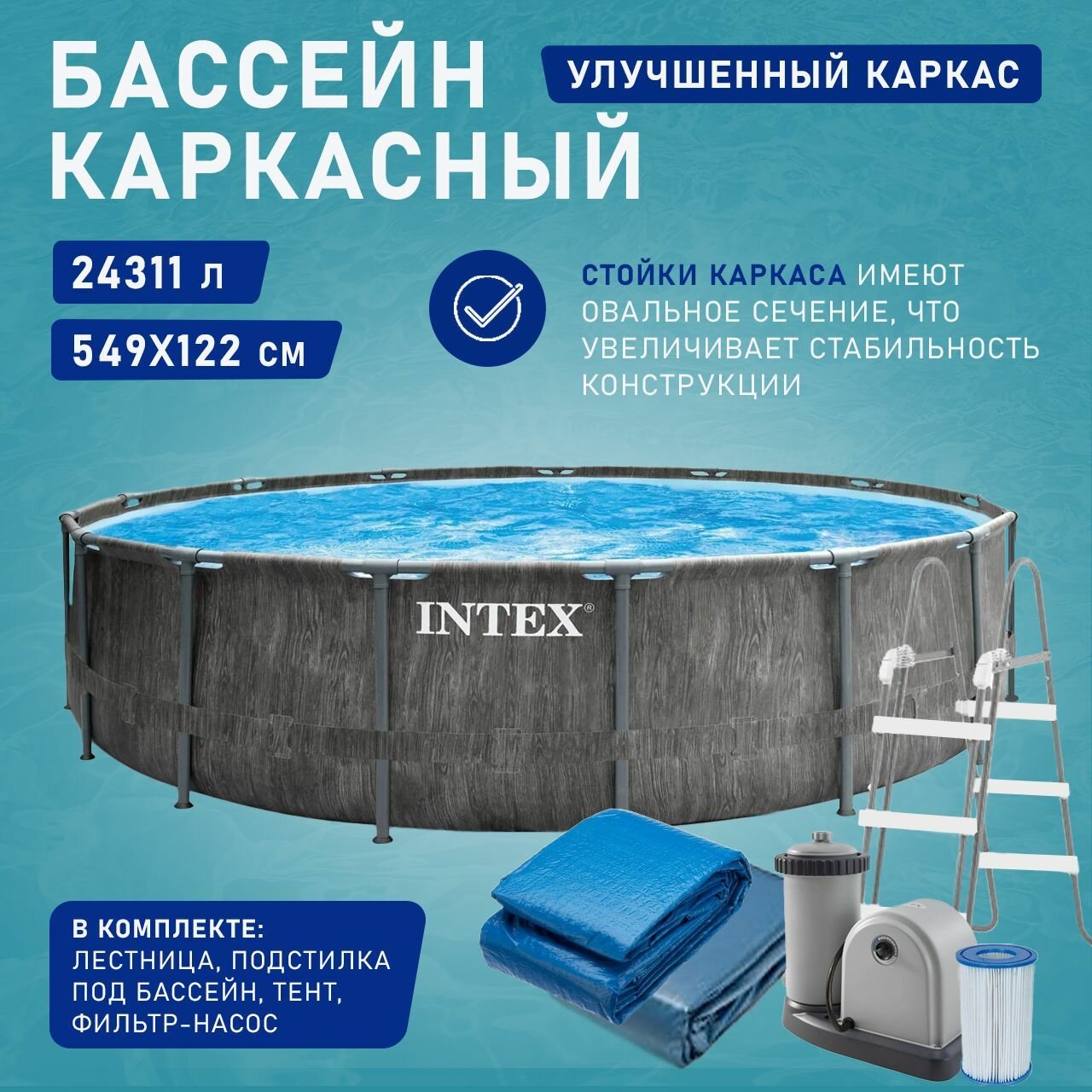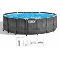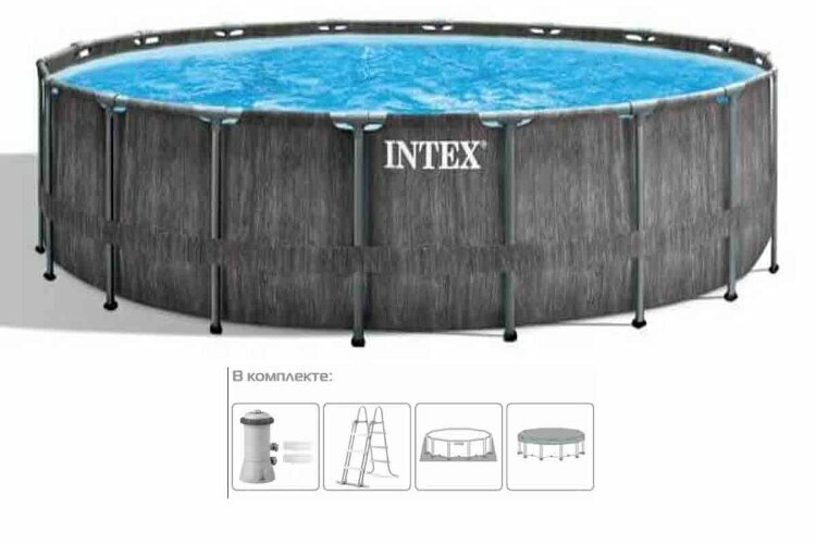 Каркасный бассейн круглый Intex Grey Wood, 549х122см фил.-насос 5678лч, лестница, тент, подстилка: сравнение цен, характеристики, фото, актуальное наличие и цены.