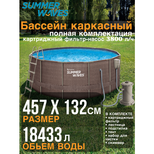 Устойчивость и прочность бассейнов Summer Escapes также значительно повышается за счет металлического каркаса, который может выдерживать большие нагрузки (в таких бассейнах одновременно смогут купаться сразу несколько человек). Чаша оборудована удобным сливным клапаном для подсоединения к садовому шлангу. С его помощью воду из бассейнов можно сливать в любое удобное место, либо поливать участок! Покупка каркасных бассейнов Summer Waves не оставит равнодушным вас и ваших близких. Комплектация: Бассейн Фильтр-насос 3800 л/ч Картридж Скиммер Комплект для чистки Лестница Тент Подстилка под бассейн Инструкция по установке и монтажу Параметры упакованного товара: Вес: 84 кг Объём: 0.4157 куб. м Длина: 130 см Ширина: 77 см Высота: 36 см