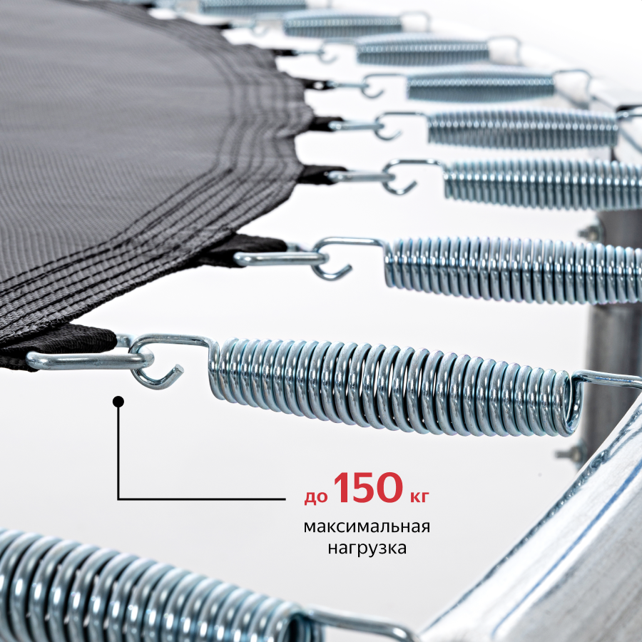 Безопасность прыжков обеспечена защитной сеткой и матом, закрывающим твёрдые элементы тренажёра. Стальной каркас с тремя опорами не допускает наклонов, раскачивания и переворачиваний.