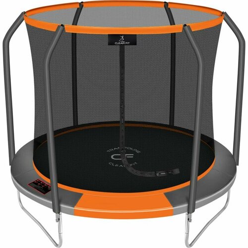 Каркасный батут с защитной сеткой Clear Fit серии OrangeHop — отличаются комфортом и надежностью. Надежная рама из качественных комплектующих, прочная защитная сеть снабжена прямым креплением к прыжковому полотну и дополнительной защитой входа, наверху каркасное жесткое крепления, сеть не провисает и не слетает во время тренировок. Увлекательный, полезный и безопасный тренажер для всей семьи. Батуты серии OrangeHop 6Ft и 8Ft поставляются в оптимальной для комфорта и безопасности комплектации: батут, верхняя защитная сеть и защитный мат. Размер батута 8 футов с прыжковой поверхностью 2.015 м легко разместить на любом участке, он подойдет и для детских игр, и для тренировок. Верхняя защитная сеть оберегает от падений, усиленная молния и дополнительная защита входа уберегут малышей от случайного входа или падения. Надежный каркас из гальванизированной стали, качественные комплектующие и погодостойкие метизы рамы делают батут безопасным, устойчивым, надежным, гарантируют полную защиту от коррозии и долгий срок службы. Максимальный вес пользователя батута OrangeHop 8Ft — до 120 кг. Батуты OrangeHop предназначены не только для детских игр, но и для фитнеса. Благодаря инновационной системе крепления защитной сети значительно увеличено рабочее пространство и надежность конструкции. Тренировки на батуте — это отличная аэробная нагрузка: улучшение общей физической формы, заряд положительных эмоций, улучшение работы кардиоваскулярной системы, развитие чувства равновесия и координации в пространстве для пользователей любого возраста. Занятия на свежем воздухе укрепляют иммунитет, снабжают организм кислородом, повышают выносливость как у детей, так и у взрослых. Именно поэтому мы используем только высококачественные комплектующие с большим запасом прочности. В большинстве случаев батуты данного типа устанавливаются под открытым небом, обязательные требования к материалам — это влагостойкость, термоустойчивость, в том числе и к низким температурам, переносимость ультрафиолетовых лучей и износостойкость. Конструкция для обеспечения безопасности выполнена из гальванизированной стали, диаметр стальных труб W-опор 34 мм и каркаса 38 мм. Каркас из труб толщиной 1.2 мм легко соединяется, опоры крепятся в приваренные к каркасу основания, все соединения изготовлены из высококачественных гальванизированных метизов. Качественная оцинковка всех труб конструкции исключает коррозию, увеличивает срок эксплуатации батута. Прыжковое полотно — это основной элемент батута. Материал прыжкового полотна Перматрон (Permatron) — эластичный материал, способный возвращаться в исходное состояние при постоянном воздействии с разным усилием. Термообработка волокон материала обеспечивает высокую прочность на разрыв и стрессоустойчивость материала. Это влагостойкий, эластичный термоустойчивый материал, не поддающийся распаду от ультрафиолета. Пружины выполнены из гальванизированной стали толщиной 3 мм, устойчивы к коррозии и долговечны, длина пружин 140 мм, для батута размером 8 футов.