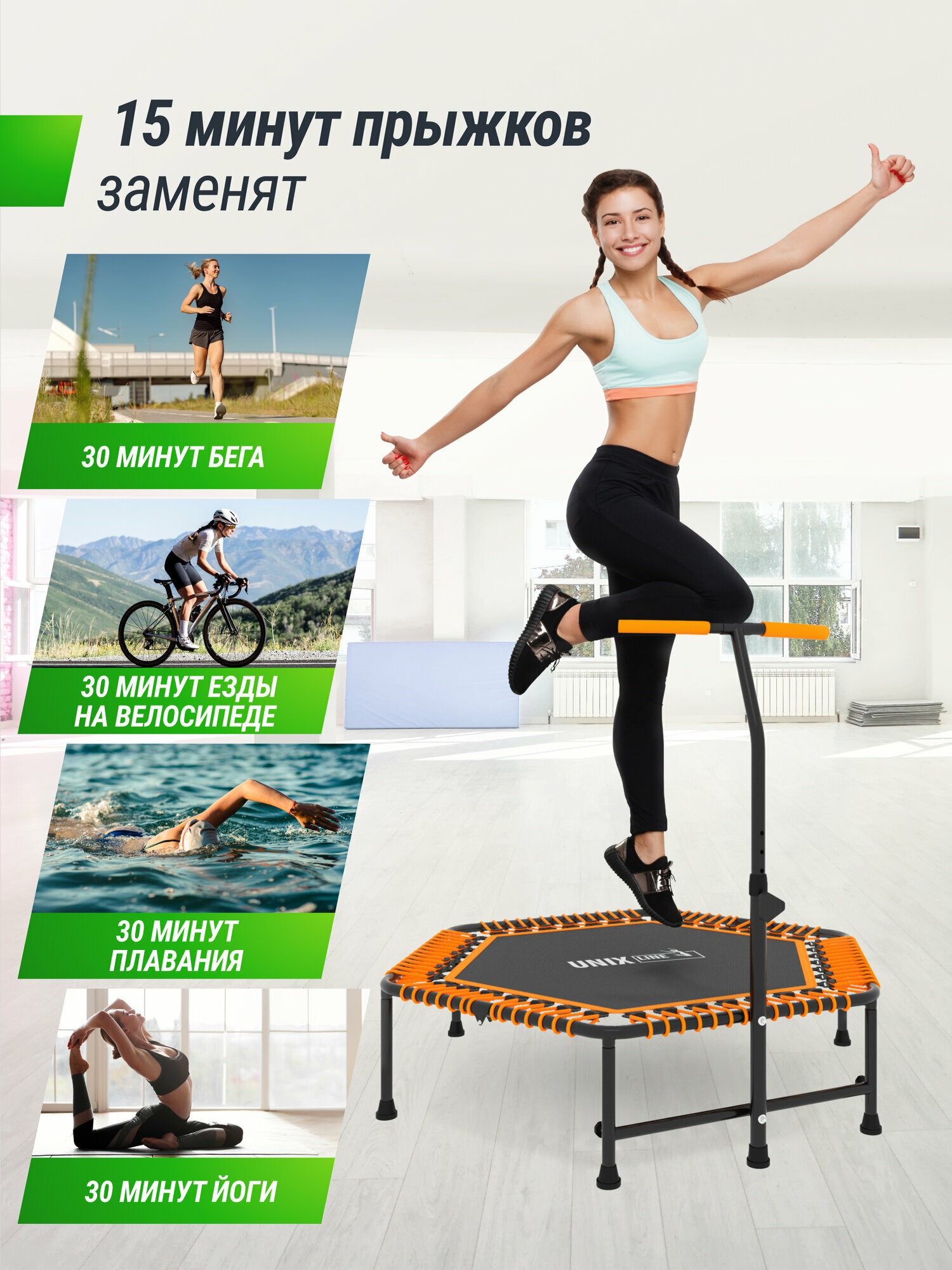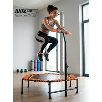 Спортивный батут для фитнеса UNIX Line Fitness – это простота и легкость сборки, высокая безопасность и качественные материалы. Данная модель батута разработана специально для занятий Джампингом (Jumping). Джампинг - это фитнес-программа и упражнения, которые выполняются на круглых батутах со специальными опорами. Это сочетание аэробной и силовой нагрузки, а также упражнения на баланс и растяжку. Упражнения на батуте помогают улучшить работу сердечно-сосудистой и лимфатической систем. Одно из основных преимуществ батута для фитнеса заключается в том, что он позволяет выполнять кардиотренировки без нагрузки на суставы, что делает его идеальным выбором для тех, у кого есть проблемы с суставами или травмы. Мощная шестиугольная рама с толщиной стали 1.5 мм и дополнительная горизонтальная поперечина придает жесткость конструкции и позволяет выдерживать самые продолжительные и интенсивные тренировки. Регулируемая Т-образная ручка на кронштейне имеет 5 уровней регулировки высоты (от 72 см до 92 см) и легко подстраивается под рост пользователя. Модель UNIX Line Fitness предназначена как для групповых занятий, так и для домашних тренировок. Максимальный вес пользователя составляет 130 кг. Прыжковое полотно из материала Permatron соединяется с рамой с помощью 42 ) переплетов бесшумного жгута. Permatron – эластичный материал, легко возвращающийся в исходное состояние при постоянном воздействии с разной нагрузкой. Он устойчив к внешним воздействиям: ультрафиолету, плесени, влаге, резким изменениям температуры. Термическая обработка делает эту ткань устойчивой к постоянным изгибам и стрессовым нагрузкам. Прыжковое полотно для батута, изготовленное из перматрона, подходит для применения дома и на улице. Этот материал не боится осадков и воздействия солнечных лучей, также обладает антисептическими свойствами. Батут для фитнеса с ручкой поможет весело провести время, снять стресс, улучшить координацию, укрепить мышцы тела и избавиться от лишнего веса. Спортивный батут оснащен регулируемой по высоте ручкой. Батут можно использовать не только взрослым, но и детям в качестве развлечения, он не занимает много места и станет приятным необычным времяпрепровождением.