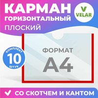 Карман информационный Velar для стенда А4 (297х210 мм) со скотчем, красный кант, плоский настенный, прозрачный горизонтальный, ПЭТ 0,3 мм, 10 шт: сравнение цен, характеристики, фото, актуальное наличие и цены.
