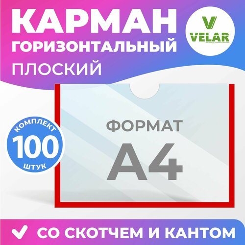 Карман информационный Velar для стенда А4 (297х210 мм) со скотчем, красный кант, плоский настенный, прозрачный горизонтальный, ПЭТ 0,3 мм, 100 шт: сравнение цен, характеристики, фото, актуальное наличие и цены.