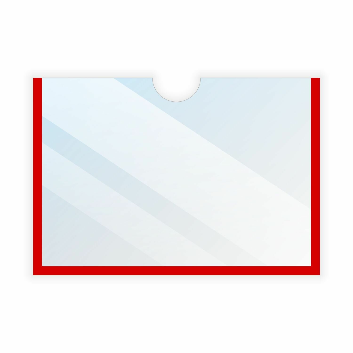 Карман информационный Velar для стенда А4 (297х210 мм) со скотчем, красный кант, плоский настенный, прозрачный горизонтальный, ПЭТ 0,3 мм, 100 шт
