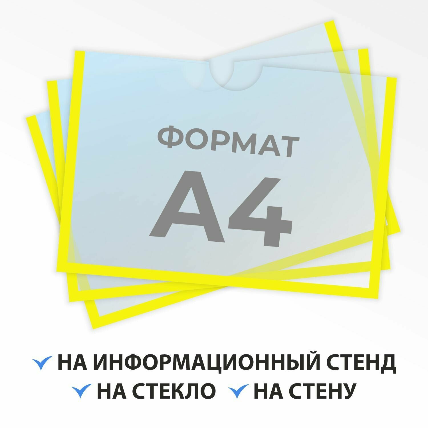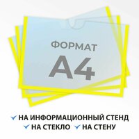 Карман информационный Velar для стенда А4 (297х210 мм) со скотчем, желтый кант, плоский настенный, прозрачный горизонтальный, ПЭТ 0,3 мм, 10 шт: сравнение цен, характеристики, фото, актуальное наличие и цены.