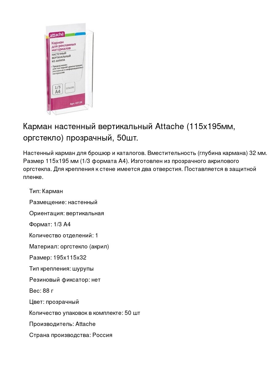 Карман настенный вертикальный Attache (115×195мм, оргстекло) прозрачный, 50шт.: сравнение цен, характеристики, фото, актуальное наличие и цены.