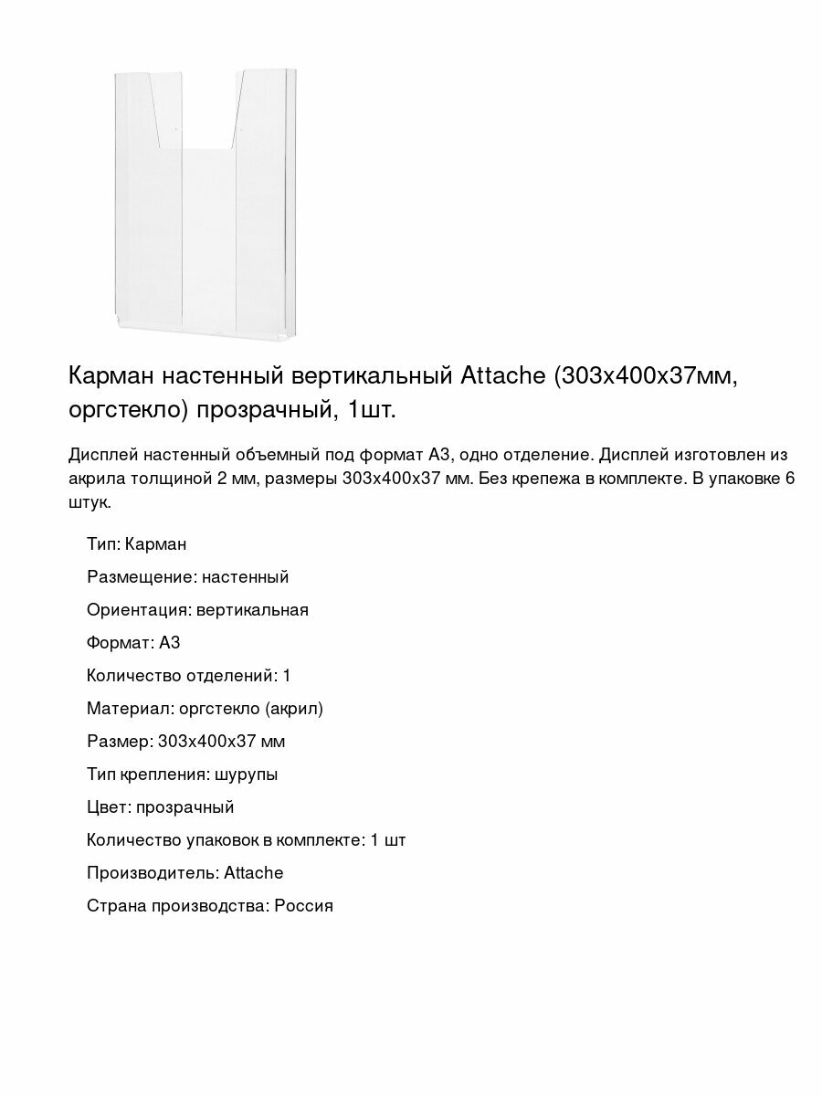 Карман настенный вертикальный Attache (303x400x37мм, оргстекло) прозрачный, 1шт.: сравнение цен, характеристики, фото, актуальное наличие и цены.