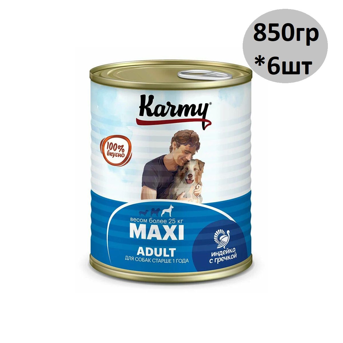KARMY MAXI Adult Полнорационный консервированный корм для взрослых собак крупных пород с индейкой и гречкой, 850г*6шт: сравнение цен, характеристики, фото, актуальное наличие и цены.