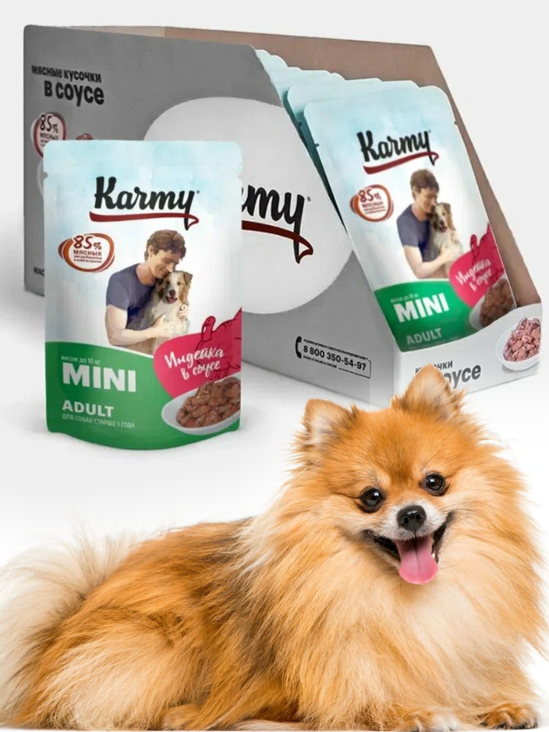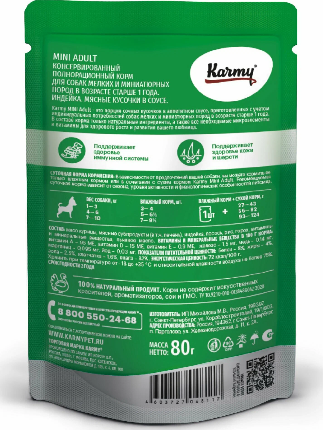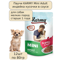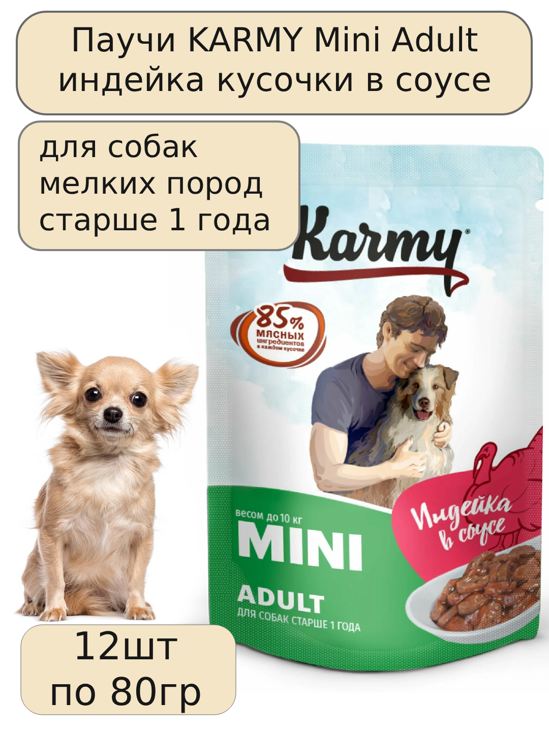 KARMY Mini Adult влажный корм для собак мелких пород старше 1 года Индейка кусочки в соусе 80г*12шт: сравнение цен, характеристики, фото, актуальное наличие и цены.