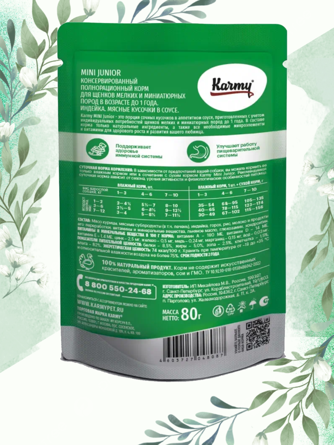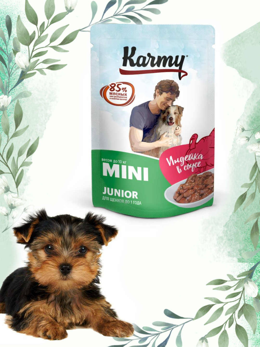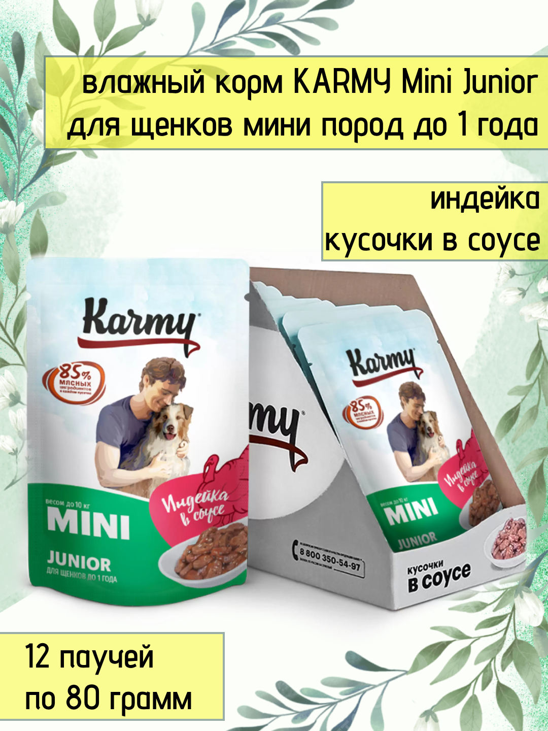 KARMY Mini Junior влажный корм для щенков мелких пород в возрасте до 1 года Индейка кусочки в соусе 80г*12шт: сравнение цен, характеристики, фото, актуальное наличие и цены.