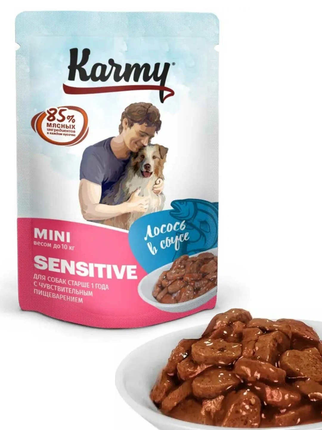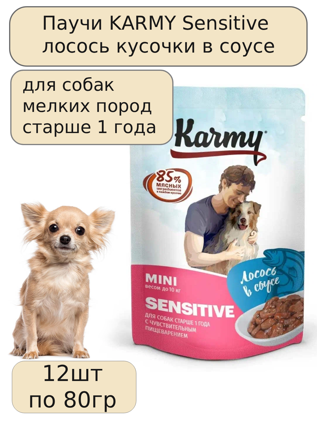 KARMY Sensitive влажный корм для собак мелких пород с чувствительным пищеварением старше 1 года Лосось кусочки в соусе 80г*12шт: сравнение цен, характеристики, фото, актуальное наличие и цены.