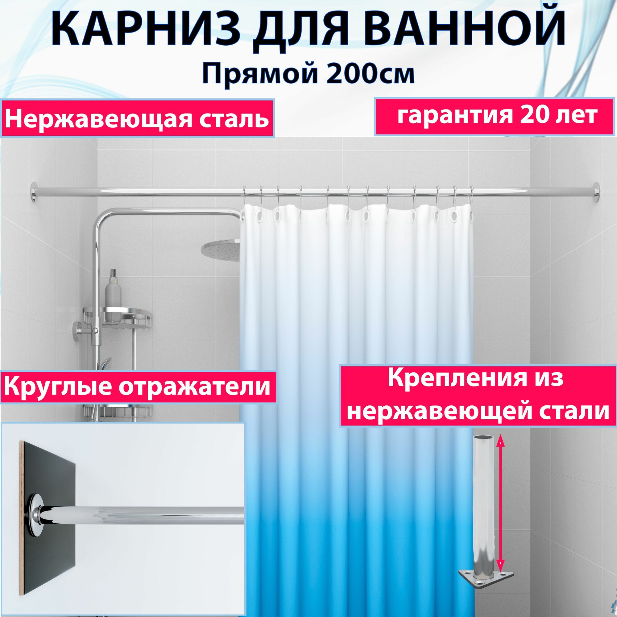 Карниз для ванной 200см Прямой Усиленный, цельнометаллический из нержавейки: сравнение цен, характеристики, фото, актуальное наличие и цены.