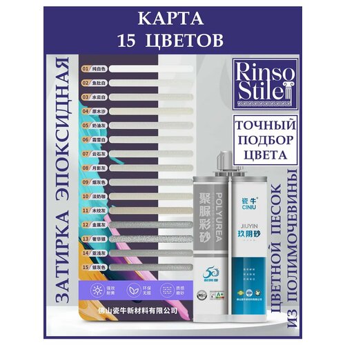 Карта 15 цветов эпоксидной затирки "Цветной песок из полимочевины" в тубе от бренда Rinsostile. С помощью карты цветов можно точно и профессионально подобрать цвет шва затирки под керамическую плитку, керамогранит, различную мозаику, плитку из натурального и искусственного мрамора, натурального камня и другую настенную и напольную плитку. Затирка в тубе «Полиаспарагиновый Цветной песок из полимочевины» — это новый современный и технологичный состав от бренда Rinsostile для всех видов внутренних и наружных работ. Срок службы - 50 лет.