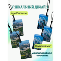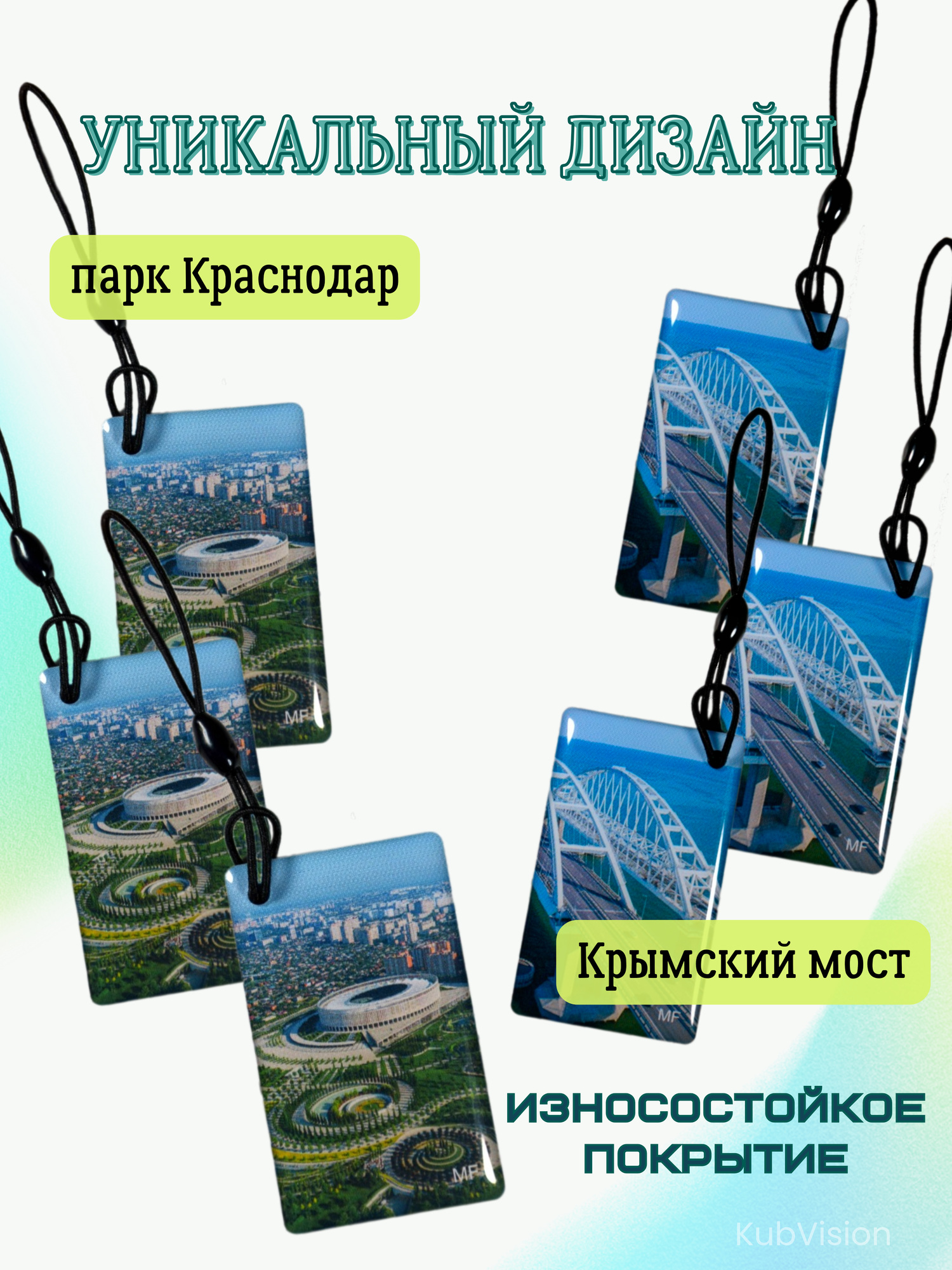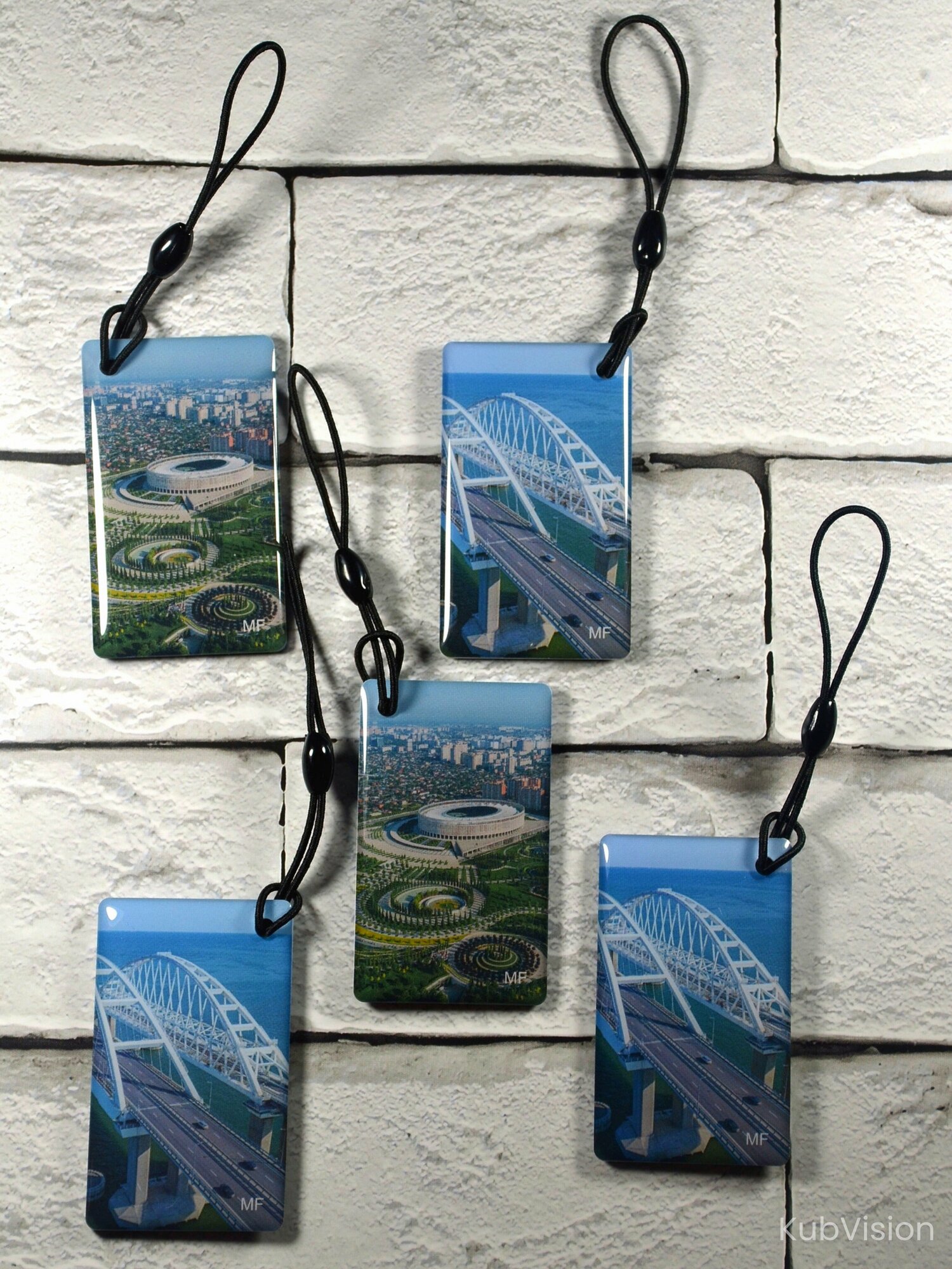 Современный и стильный бесконтактный неперезаписываемый RFID-брелок, электронный ключ, карта доступа типа MIFARE, работающий на частоте 13.56 МГц. Брелоки имеют яркий эргономичный двухсторонний дизайн с изображением Крымского моста и парка Галицкого (Краснодар). Используется в системах ограничения доступа: многоквартирные домофоны, индивидуальные домофоны, офисные и складские системы пропуска. В основном используется как ключ к домофону. Метки привязываются к имеющемуся СКУД или домофону. Корпус брелока содержит износостойкое покрытие, позволяющее ему восстанавливаться после нанесения небольших царапин или вмятин, а также стойкое к воздействию масел, бензина и ультрафиолета (препятствует быстрому выгоранию изображения от воздействия солнечных лучей).