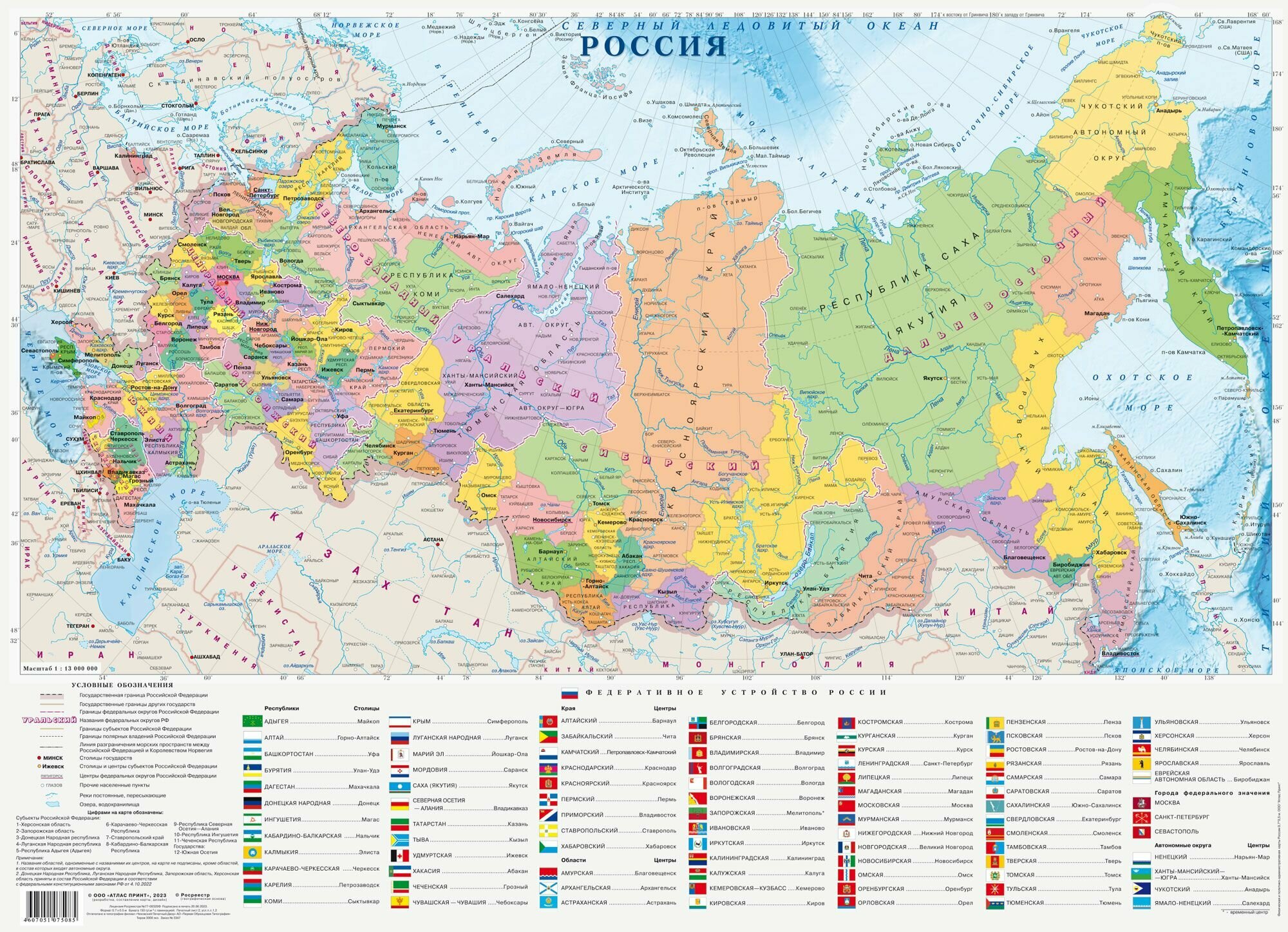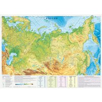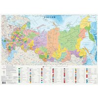Вторая двусторонняя карта – России. С одной стороны – политико-административная: субъекты Федерации, столицы, основные населённые пункты, флаги регионов. Масштаб 1:13 000 000 даёт возможность рассмотреть не только федеральное устройство, но и взаимное расположение краёв, областей, республик. С другой стороны — физическая карта России: от западных равнин до восточных хребтов, от арктических побережий до степей юга. Показана природа территории, её высоты, низменности, водоёмы, тектоническая структура.