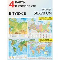 Две двусторонние карты, 4 карты в одном тубусе. Перед вами не просто карты, а возможность взглянуть на устройство Мира и России одновременно с двух сторон. В комплекте две настенные двусторонние карты: Мира и России. Каждая географическая карта в формате 70×50 см, с ламинированным покрытием и качественной печатью. Каждая карта содержит два типа картографических данных: политические и физические.